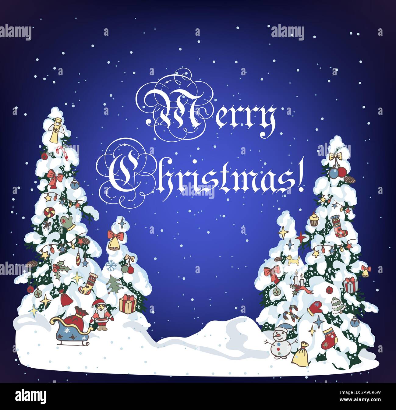 Snow Xmas Tree On Holiday Night Background Winter Evergreen Christmas Tree Pine With Decorated With Spruce Toys In Winter Forest Christmas Trees Background New Year Background For Design Of Postcard Or Banner